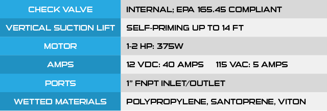PUMP ONLY, 12 VDC WITH ON/OFF SWITCH, 18′ CABLE WITH BATTERY CLIPS, 50 AMP FUSE